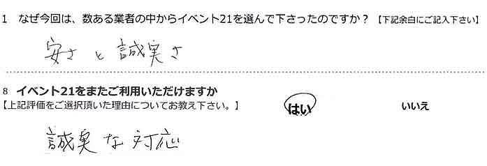 この度は弊社をご利用頂きありがとうございました!嬉しいアンケートありがとうございます! また機会がありましたら是非よろしくお願いします、お待ちしております!