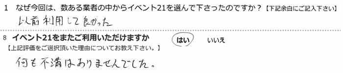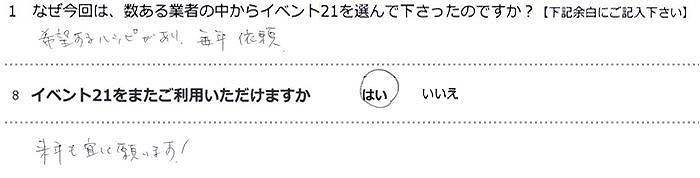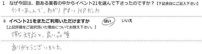 お客様のイベントが大盛況いたしましたこと、大変うれしく思います。また何かありましたら是非ご利用お願いいたします。