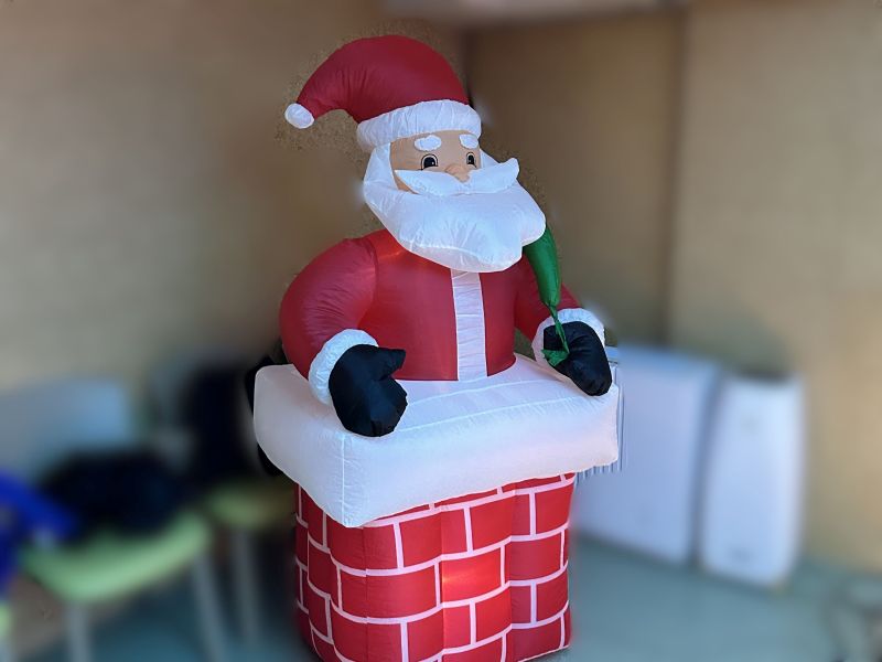 煙突サンタエアポップは、コンセントを挿してわずか三分で組み上がります。 その間は放っておいても完成するのですが、せっかくなのでサンタさんの形になるのを見ているのも面白いですよ! クリスマスシーズンは忙しいことに煙突に体を入れて、子供たちにプレゼントを届けている真っ只中ですが、営業スマイルは忘れておりません。 イベントにやってきたたくさんのお客様を笑顔で迎え入れてくれます!クリスマスイベントに是非ご利用ください!