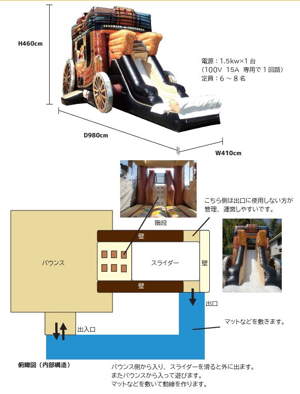 | 使用方法 | バウンス側から入り、スライダーを滑ると外に出ます。またバウンスから入って遊びます。マットなどを敷いて動線を作ります。 |