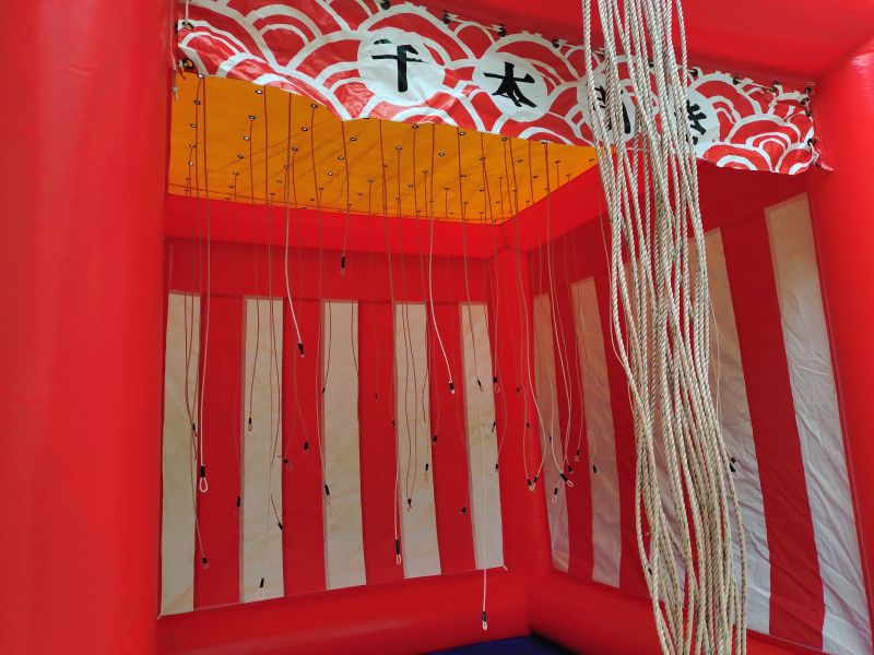 縁日や感謝祭などイベントの盛り上げにおススメ!インパクト抜群の巨大千本引きです。 フックに景品をかけておき、お客様に好きな紐をひいてもらってどの景品が当たるか楽しんでもらうゲームです。フックは全部で45本あります。 真っ赤な柱と吊られた紐、めでたい紅白幕。楽しい雰囲気満載です! 空気で膨らむエアー式なので、この巨体でも設置が簡単です。1人運営も可能なので、ぜひ、いかがでしょうか?