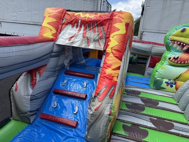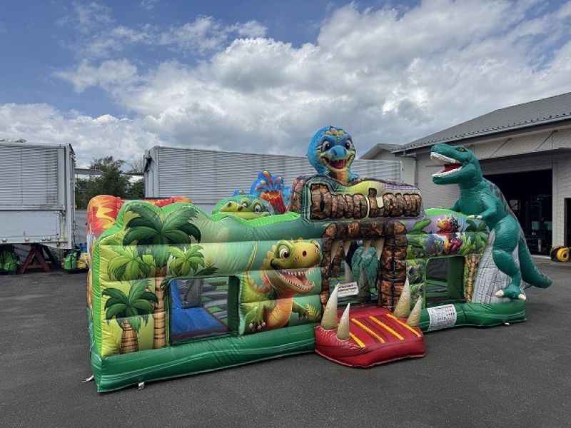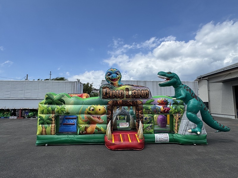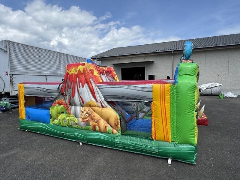 「グリーンディノ」は、恐竜をモチーフにした大型ふわふわ遊具です。インパクトのある外観と入口の赤い牙型スロープが目を引き、内部にはスライダーや障害物など、子どもたちが夢中で遊べる仕掛けがいっぱい。会場の主役級の存在感で、イベントの集客力アップにも貢献します。設置には電源が2口必要ですが、送風機含めスタッフがしっかり対応いたしますのでご安心ください。