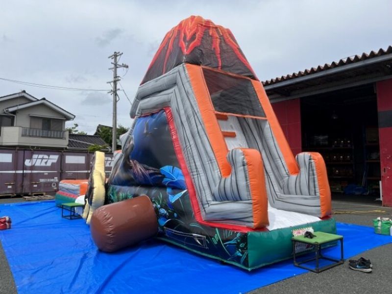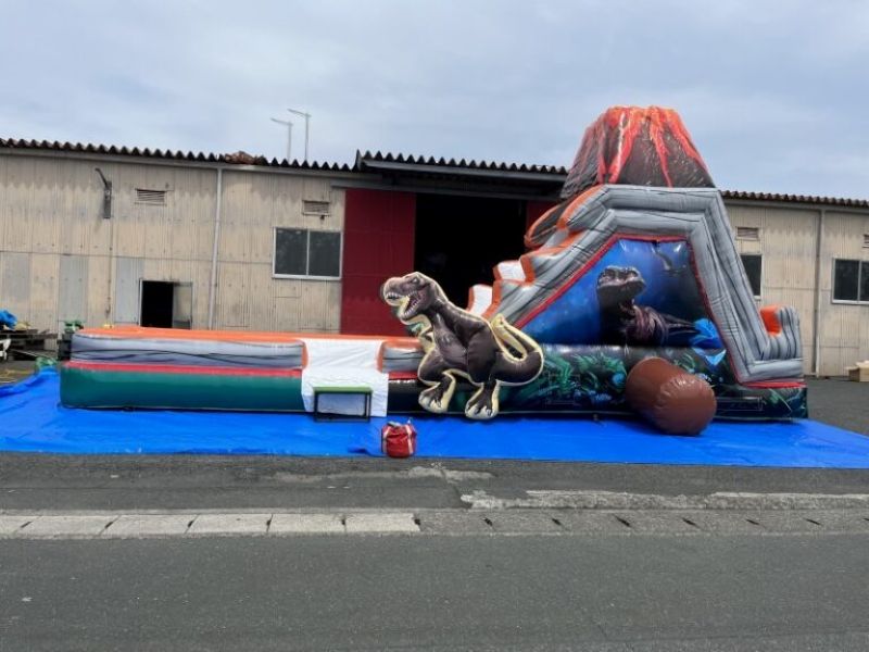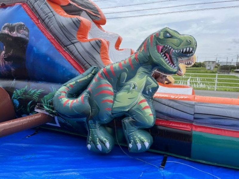 大人気の恐竜モチーフ遊具に、滑り台型が登場! お子さまがティラノサウルスの体内から滑り出すようなスリルとワクワク感が楽しめる、インパクト抜群のふわふわスライダーです。 イベントのメインアトラクションとしてはもちろん、恐竜コーナーの演出や子ども向けフェスなどにもぴったり。 見た目の迫力だけでなく、安全性にも配慮されており、風で倒れないようウェイト付きで設置します。