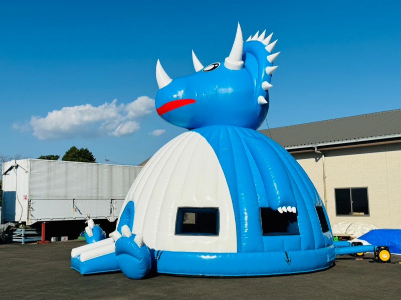 イベントで目を引くこと間違いなし!大人気の恐竜「トリケラトプス」をモチーフにした、可愛らしいドーム型バウンス遊具が新登場しました! 水色と白の爽やかなカラーで、お子様も思わず駆け寄りたくなるデザインです。 ウォールモデル構造により、内部の暑さを軽減しながら、安全に楽しむことができます。 さらにメッシュ窓つきで、外から中の様子を確認できるので保護者の方も安心です。 屋外・屋内問わず、会場のシンボルとして活躍するエア遊具です!