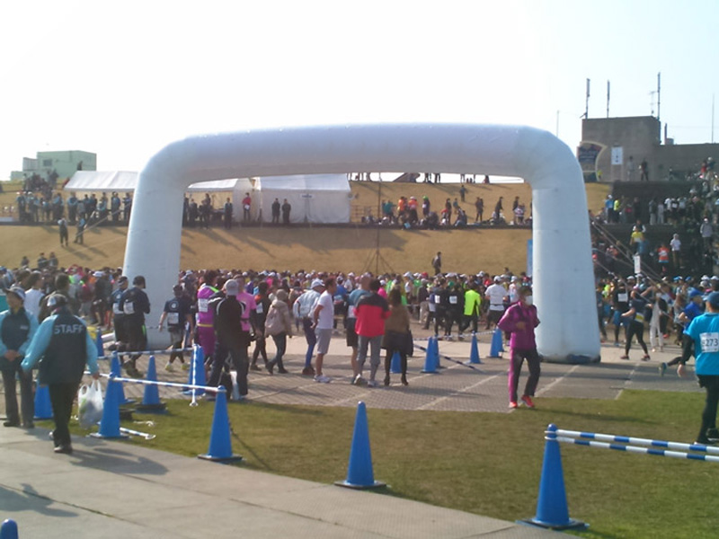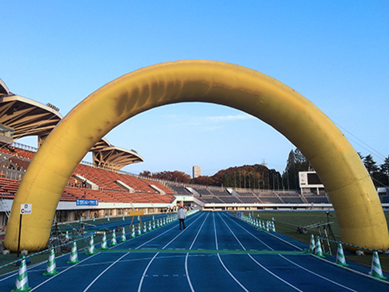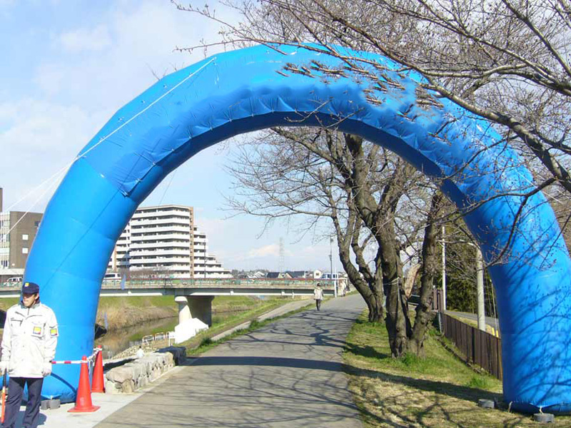 ウォーキングイベントでの会場の目印でもあり、会場の入り口役にもなるエアアーチの設営をさせて頂きました。河川敷でのイベントですので強風にも耐えれるように、 しっかりと養生をしています。また、アーチに書いてあるイベント名の表記は、貼り付けるシールではなく、横断幕を巻き付けているので、毎年名前が変わるイベントでも、 横断幕の文字を貼りかえるだけでいいので、おすすめです!イベント当日の運営やイベント自体の企画もお任せください!