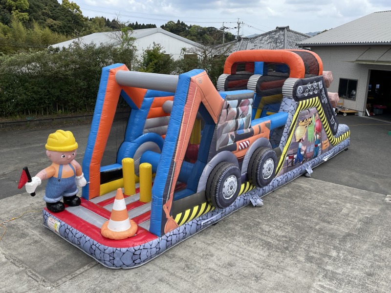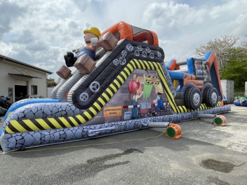 ショベルカーをモチーフにしたデザインがインパクト抜群!建設キッズアドベンチャーver.は、アスレチック要素とスライダーの要素が融合した、子どもに大人気のエアー遊具です。滑って・くぐって・飛んで、全身を使って楽しめる構成になっており、働く車がテーマのイベントや移動遊園地の目玉アトラクションとしてもおすすめ。複数台を組み合わせて「はたらく車ランド」を作るのも◎!
