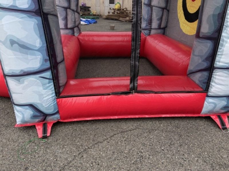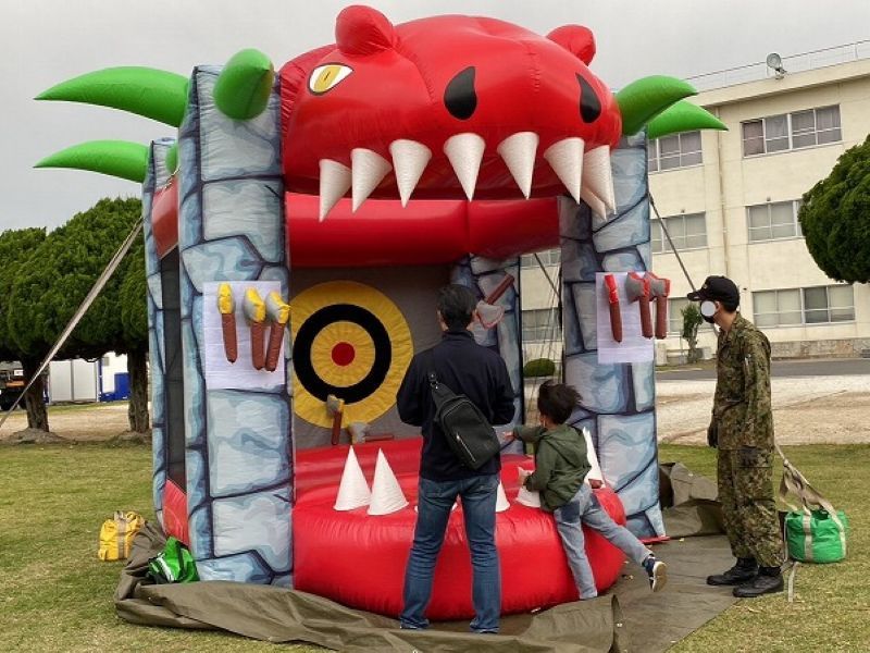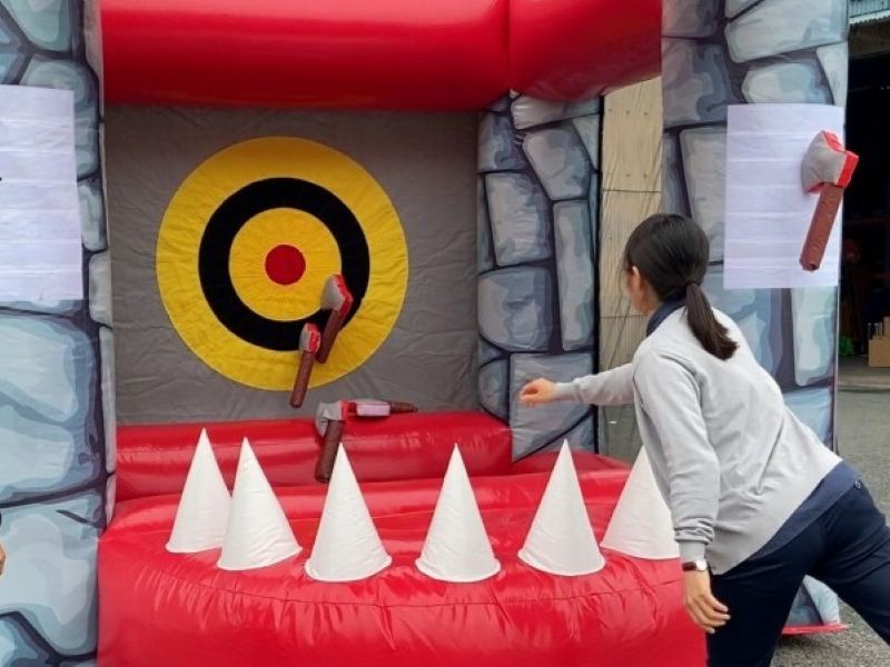 恐竜斧投げは、お子様から大人まで楽しめる恐竜デザインのエアー式のゲームです。 4.6m×4.6m×3.35mの巨大恐竜の口の中に的(マジックテープ製)があり、付属の柔らかい斧を投げつけて得点を競います。 的に命中すればくっつく仕組みで、安全かつ見た目にも迫力満点!側面ネットのファスナーから斧を素早く回収でき、運営効率も抜群です。