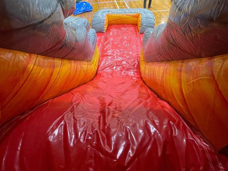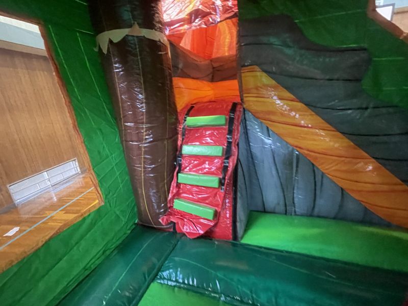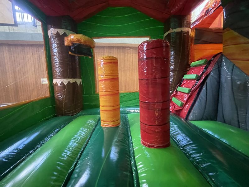こちらの商品は、入口の恐竜デザインがパッと目を引く“主役級”のエア遊具です。中は障害物つきのトランポリン構造になっていて、跳ねる・くぐる・避ける…と遊びが単調になりにくいのが強みです。 さらに階段を上ってスライダーでも遊べるので、年齢層が広めのキッズ向けイベントでも回転が作りやすく、待機列も“見せ場”になります。