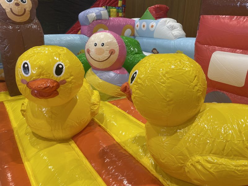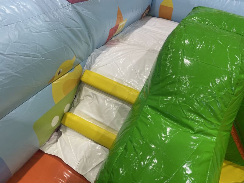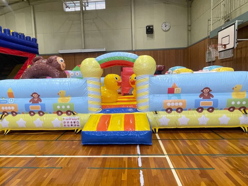 こちらの商品は、かわいい見た目と“中で遊べる仕掛け”がセットになった小型エア遊具です。中にはトンネルのような障害物や、階段→すべり台の動線があり、入った瞬間から“探検ごっこ”みたいに遊びが広がるのがポイント。 サイズ感がコンパクトなので、小さなお子さま中心のキッズコーナーや、商業施設のミニイベントにもハマります。対応人数は6〜8人目安なので、回転管理もしやすく、行列ができても運営を組み立てやすいタイプです。