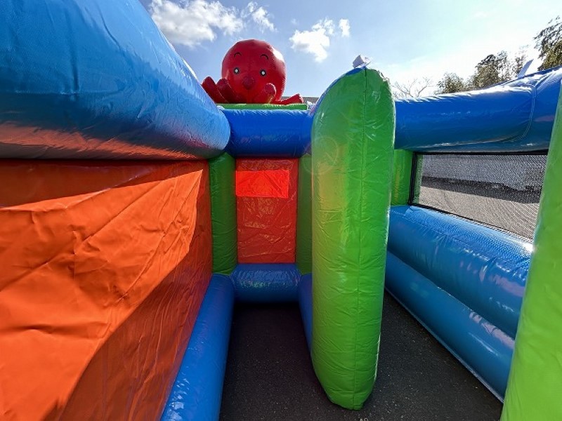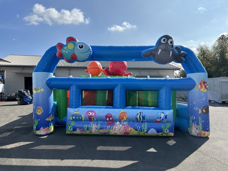 かわいいクマノミが大きくデザインされた、見た目も楽しいおさかな迷路です!ふわふわの迷路内にはひんやりとしたミストが広がっており、暑い季節のイベントにぴったり。子どもたちが夢中になって遊べるだけでなく、涼しさも楽しめるので親御さんからも大好評です。 出入り口は2か所あるため、安全性や回転率にも配慮された設計。お祭り、商業施設の集客イベント、親子向けフェスなど、さまざまなシーンで活躍します。夏場の熱中症対策にも効果的な、見た目にも涼しげなアトラクションをぜひご活用ください!