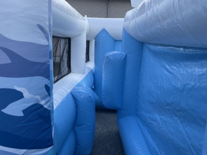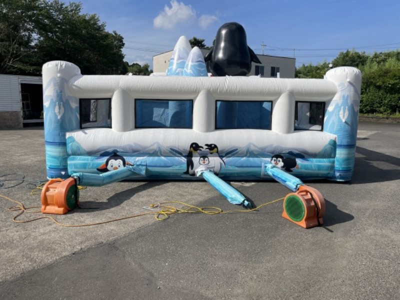 南極をモチーフにした、見た目も涼しげなペンギンミスト迷路は、暑い季節にぴったりのエアー遊具です。上部からミストが噴射される仕組みで、屋外イベントでも涼しく快適に遊ぶことができます。可愛らしいペンギンや氷山のデザインが子どもたちの注目を集め、写真映えもばっちり!迷路はコンパクトながらも入り組んだ形状になっており、意外と本気で迷う子も多数。ミストを使わずに通常のふわふわ迷路として運用することも可能で、幅広いイベントに対応できます。