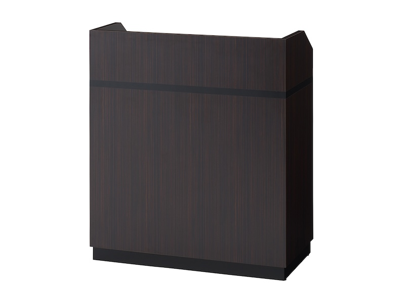 重厚感と高級感を兼ね備えた黒の演台です。落ち着いたブラウンカラーにシンプルなデザインが映え、式典や講演会、セミナーなどのフォーマルなシーンに最適です。正面に立った際に安心感を与える高さと幅があり、司会者や登壇者の存在感を引き立てます。天板部分は原稿や資料、ノートPCなどを置ける十分なスペースを確保。さらに観衆からの視線を程よく遮る構造になっているため、話し手が落ち着いて進行できるのも魅力です。見た目の美しさと機能性を兼ね備えた演台は、イベント全体の印象を格上げしてくれるアイテムです。