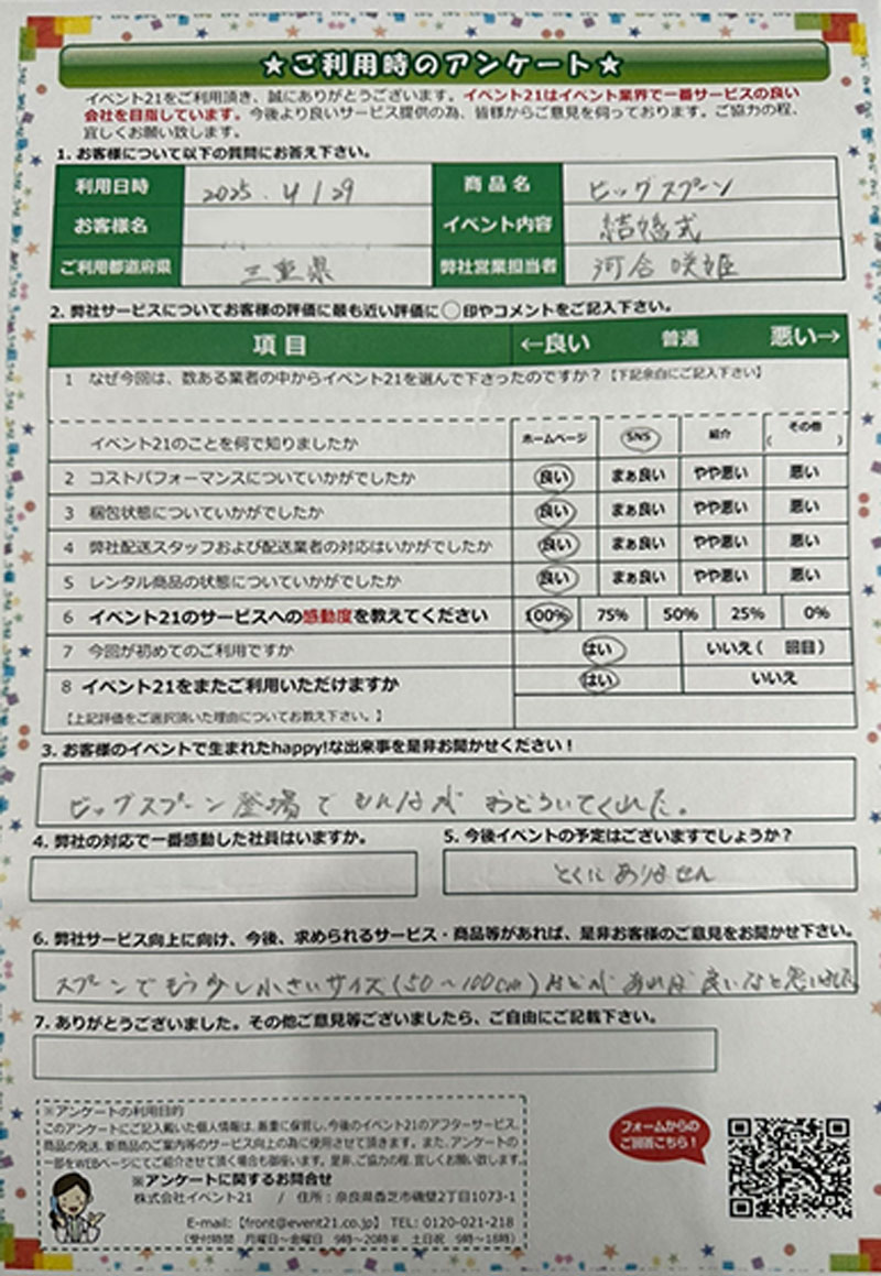ご利用ありがとうございました!ビッグスプーンで、結婚式を盛り上げることができて嬉しいです!!