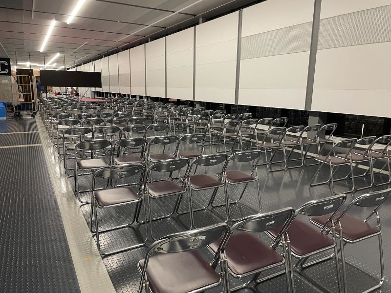 パイプ椅子って意外と1列きれいに並べるのにはコツがいるんです!でもそのコツを掴めば大量の椅子のも画像の通り規則正しく、きれいに配置することもできます!もちろんイベント21スタッフが設置から撤去まで対応可能です!