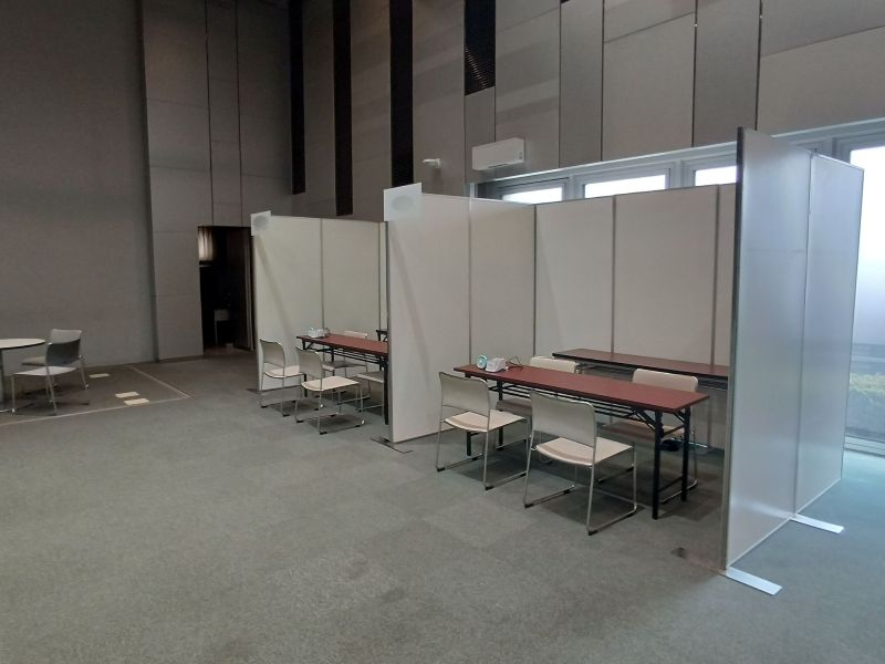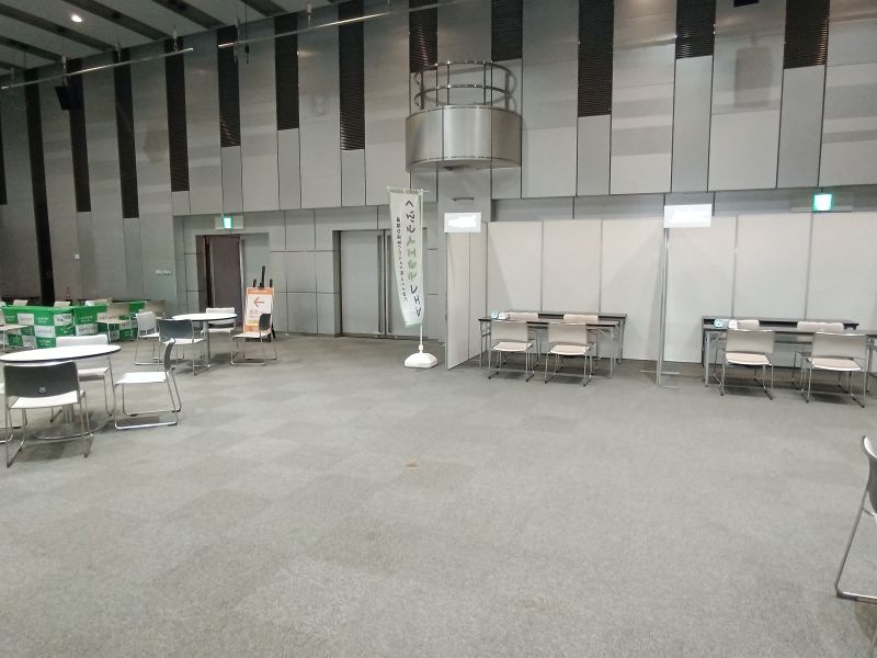 白色かライトグレーのお色目が一般的になり、どんな会場のカラーでも合わせていただきやすい商品になります。 パイプ椅子よりも少し高級感があるイメージになりますね!パイプ椅子よりも少し大きめになりますが、スタッキングというだけあって収納スペースはかなり小さく済むんです。 専用の台車をつかえば、20脚程度ならそのまま持ち運びいただけます。 勿論イベント21で設営撤去もさせていただく事も可能ですし、配達のみでもご対応できるので人員さえご用意いただければ簡単に設置いただく事も可能です。 如何でしょうか?ステージがメインのイベント21愛知支店ですが、このような屋内展示会も得意な分野です! 何かお困りだったり、こんな商品ないかなーって思われたら是非右のお問い合わせからご連絡ください