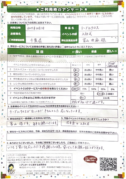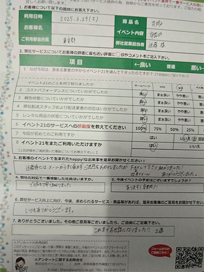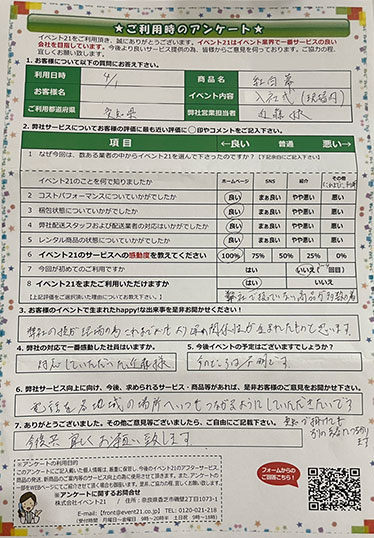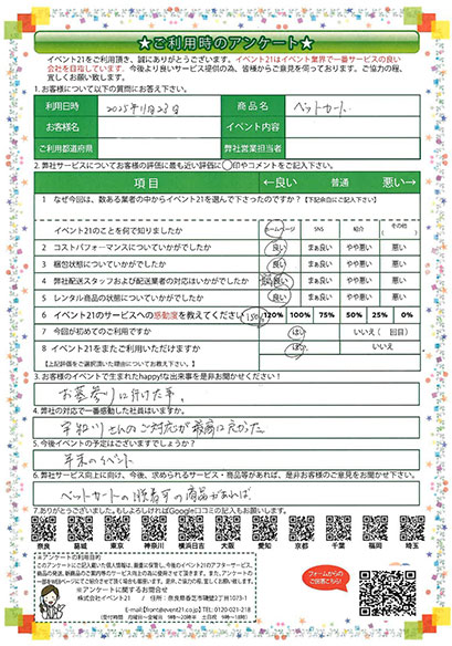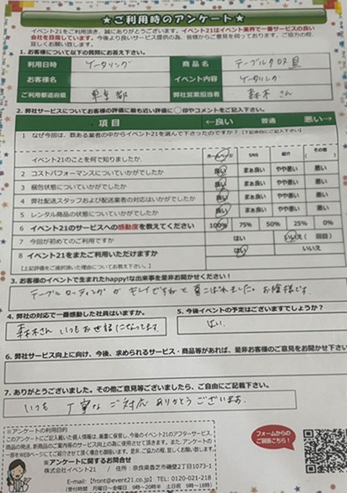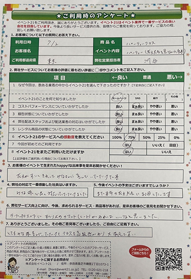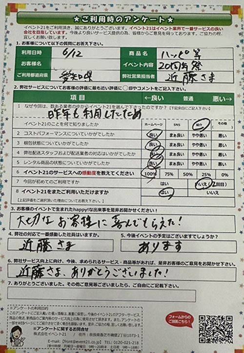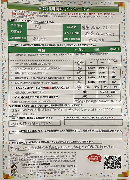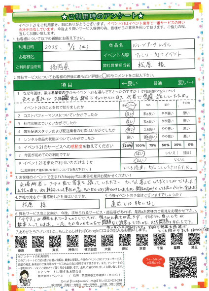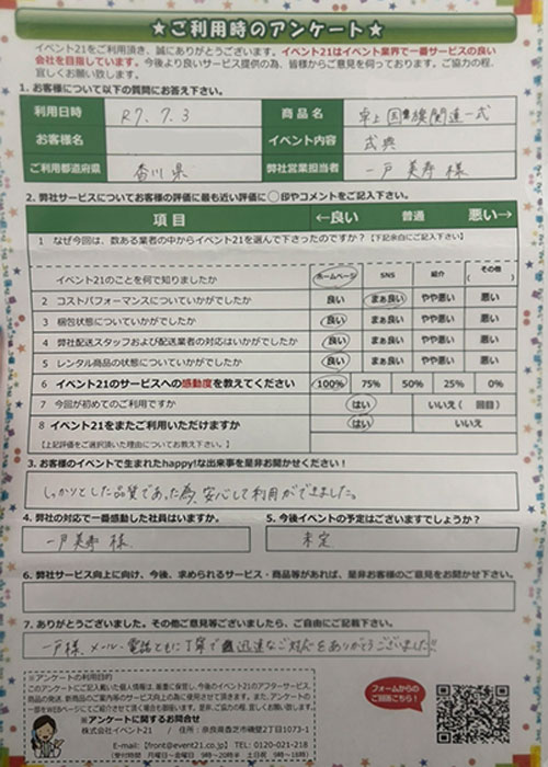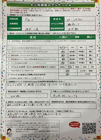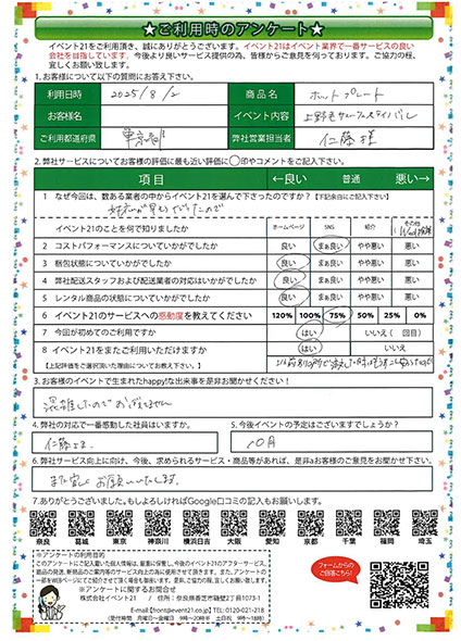 この度は弊社をご利用いただきましてありがとうございました!!無事に晴れて今年は開催できてよかったです!何かございましたらお気軽にご相談ください!引き続きよろしくおねがいいたします。