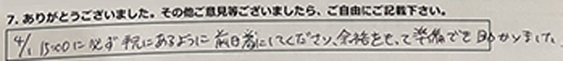 4/1 15:00に必ず手元にあるように前日着にしてくださり、余裕をもって準備ができ助かりました