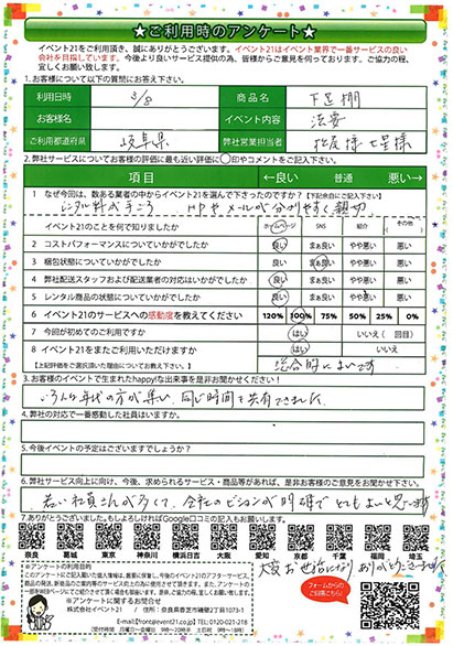 この度はご利用頂きましてありがとうございました! お客様とたくさんお話ができ、またイベントも成功させることができたこと、 大変うれしく思います! また機会がございましたらお気軽にご相談いただけますと幸いです!