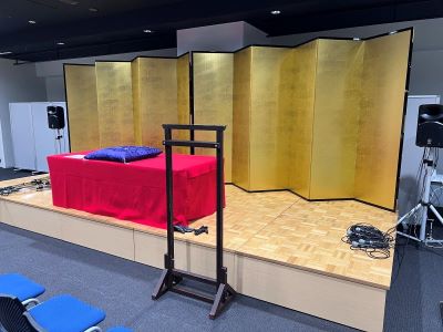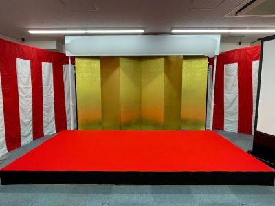 社内表彰式のためのステージと金屏風、ジョーゼット幕を準備させていただきました。