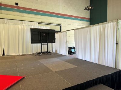 先日、弊社経営方針発表会で登場カーテンの施工をしてきました。