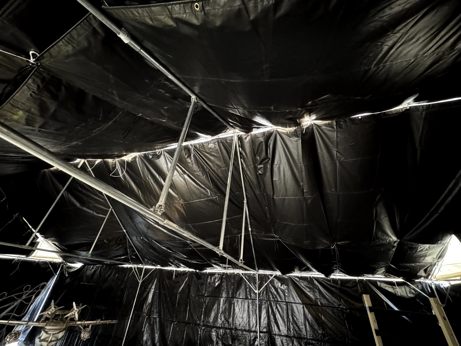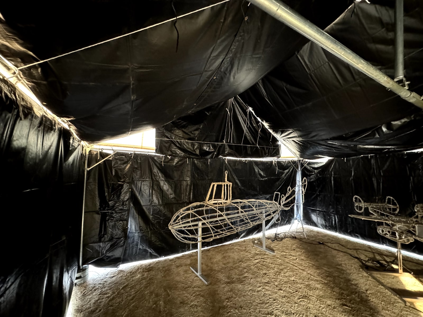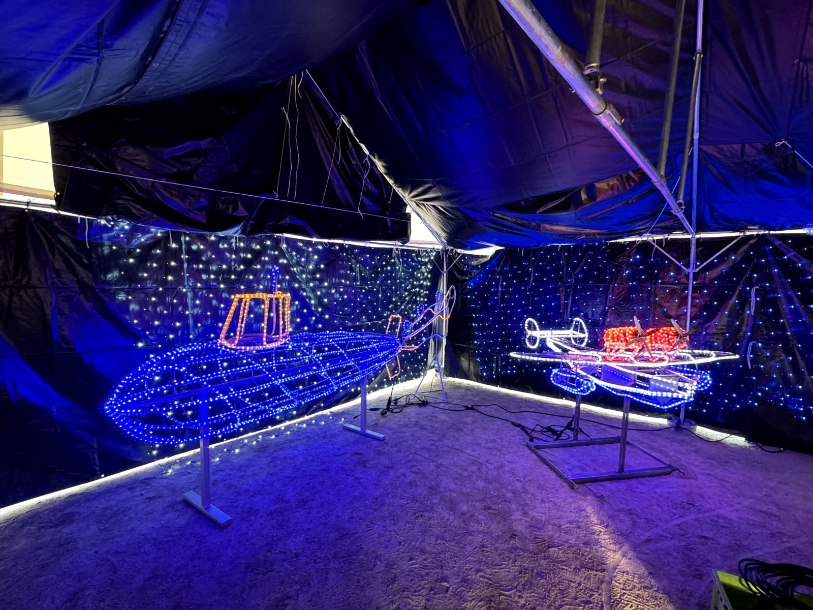 暗幕とテントを組み合わせ、イルミネーションで彩れば、屋外でも特別な展示空間を演出できます。シンプルなパイプ椅子を配置すれば、来場者がゆったりと鑑賞できる環境も整います。 写真のような幻想的な雰囲気も、すべてレンタルで実現可能です。大規模な展示会から地域イベントまで、ご希望に合わせて空間づくりをサポートいたします。