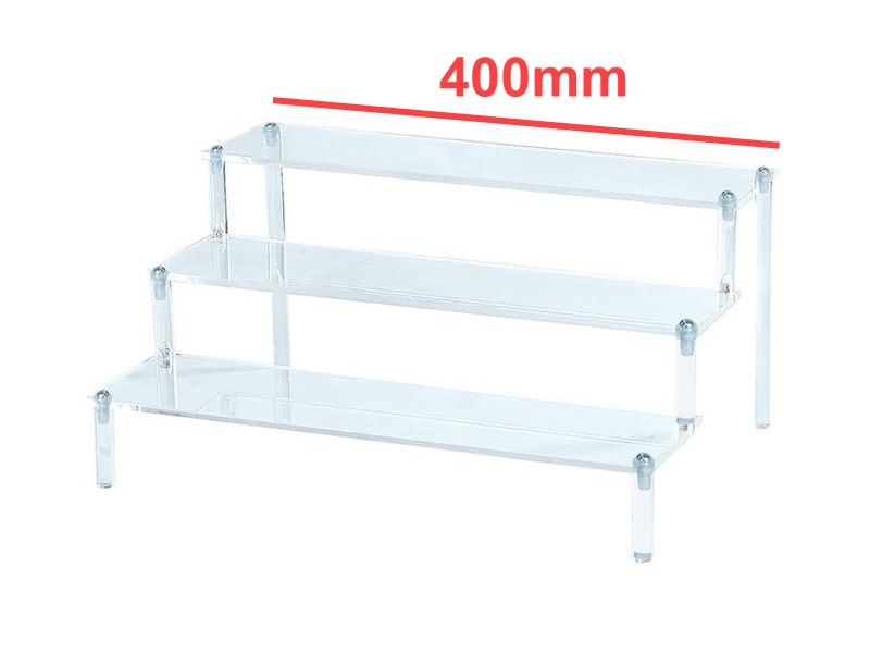 3段のひな壇形状なので、前後の商品が重なりにくく、限られた卓上スペースでも見やすいレイアウトを作りやすいのも魅力です。付属のネジでステージの四隅と脚を固定するシンプルな構造のため、組み立てもしやすいと案内されています。幅40cmなので、コンパクトな展示台を探している場合にも取り入れやすい商品です。