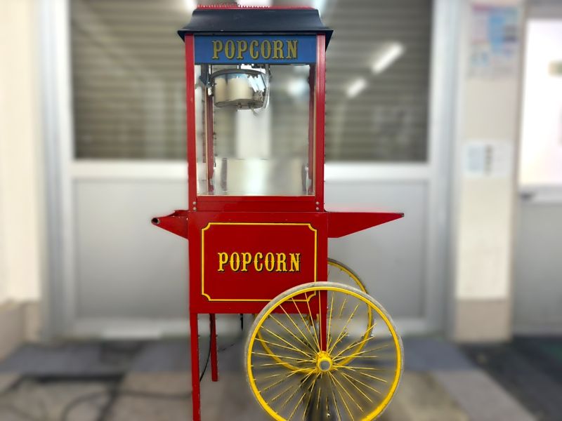 普通のポップコーン機を見たことはあるけど、台車が付いてるのは見たことがない方は多いかもしれません。 こちらは台車付きポップコーン機のご紹介です。こちらの台車付きポップコーン機、アメリカ等では定番の形だったりします。 某ネット動画配信サービスの大手会社でも同タイプの物がオフィスに置かれてたりします。 利用用途も幅広く、祭り、食事関係のイベント、映画上映のイベントと、ここには書ききれないくらいの用途がございます。 是非イベントのお供にポップコーンはいかがでしょうか。