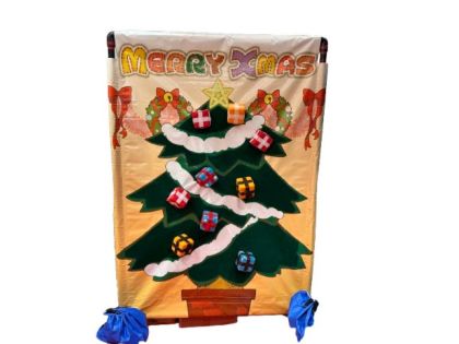 クリスマスツリーゲームのご紹介です。 オーナメントにマジックテープが取り付けてあって、そこに向けてプレゼントボックスを投げて、装飾していくという遊びになります。 バランスよく飾れるか挑戦しましょう。 投げることがまだできない小さいお子様には、ツリーに近づいて装飾させてあげるなどして、子どもたちを楽しませてあげましょう。 クリスマス時期のイベントなどに是非クリスマスツリーゲームはいかがでしょうか。 ゲームの準備も簡単にできますし、小さなお子様も保護者の補助付きで手軽にできます。