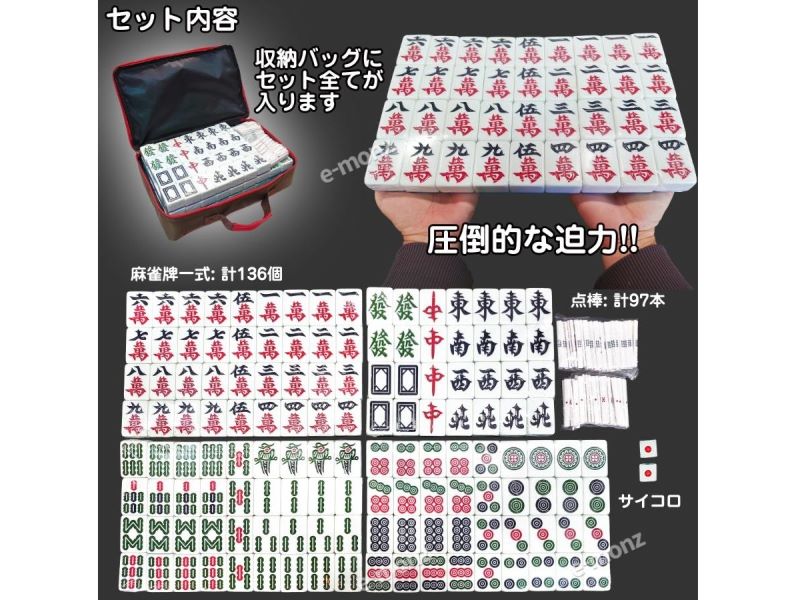 | セット内容 | 収納バッグ、麻雀牌一式×136、点棒×97、サイコロ×2 |