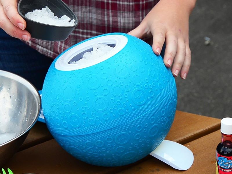 | 使用方法 | ①材料を準備する (例)・生クリーム 200ml ・牛乳 100ml ・砂糖 50g ・バニラエッセンス(お好みで) ・氷 約500g ・粗塩 約150g ②ボールの片側にアイスの材料を入れる ・液体材料をよく混ぜてから注ぎ、しっかりフタを閉める ③もう片側に氷と塩を入れる ・氷の間に塩をまぶすように入れると効果的 ・こちらもフタをしっかり閉める ④ボールを15~20分間転がす ・床や芝生などでコロコロ転がす ・途中で一度開けて中身をかき混ぜると滑らかに仕上がる ⑤アイス側のフタを開けて、完成! ・固まり具合を確認し、スプーンですくって食べる ⑥使用後は中を洗浄 ・乾燥させる ・パーツを分解し、食器用洗剤でやさしく洗う ・しっかり乾かしてからご返却ください |