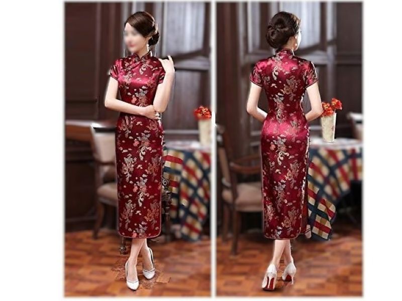 中国の伝統的な「龍鳳柄(りゅうほうがら)」が全体にあしらわれた、格式高い印象のロングチャイナ服です。