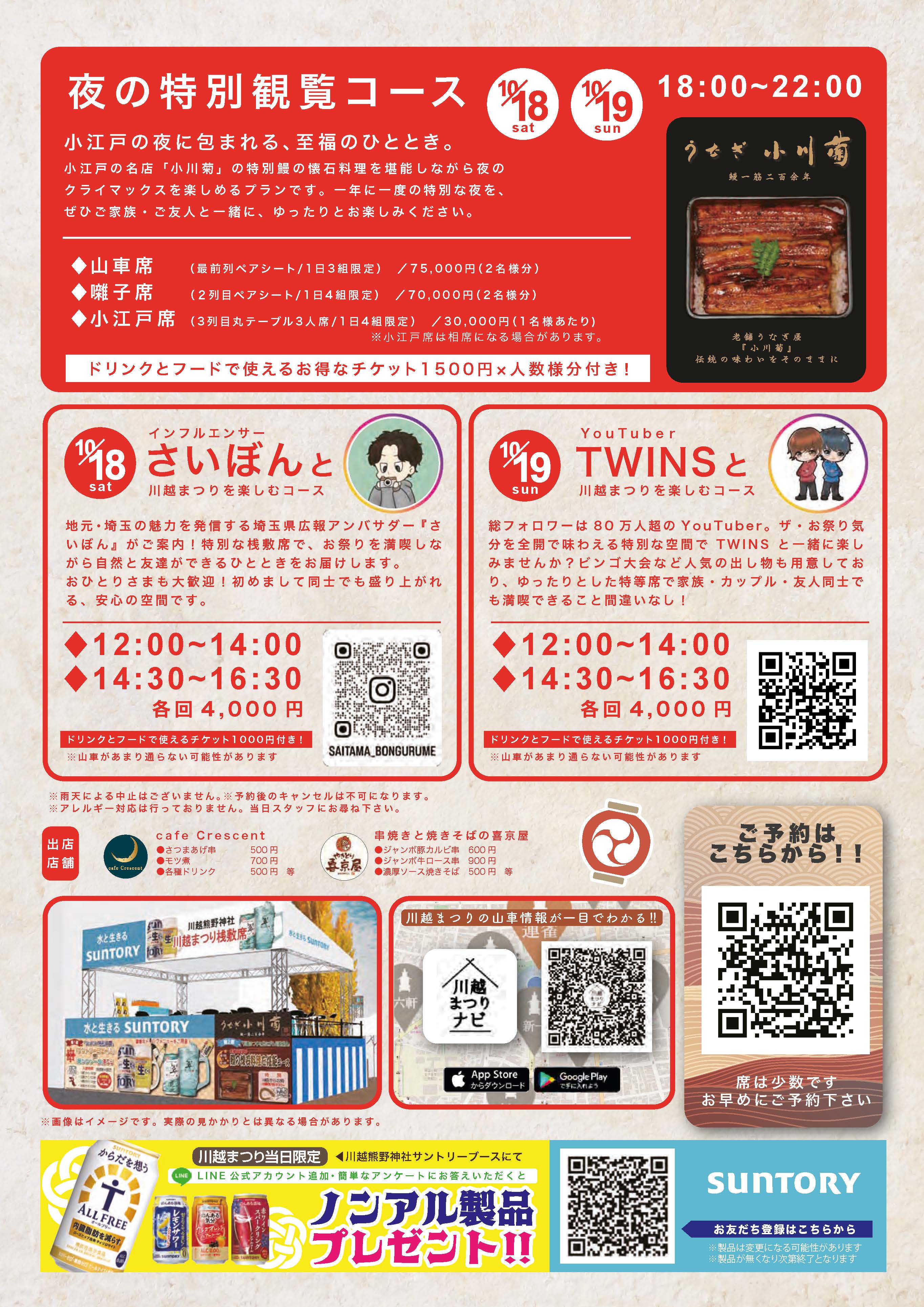 埼玉県川越市連雀町17-1 2025/10/18~2025/10/19 豪華賢覧な川越まつり夜の特別席で豪華な食事つき観覧。