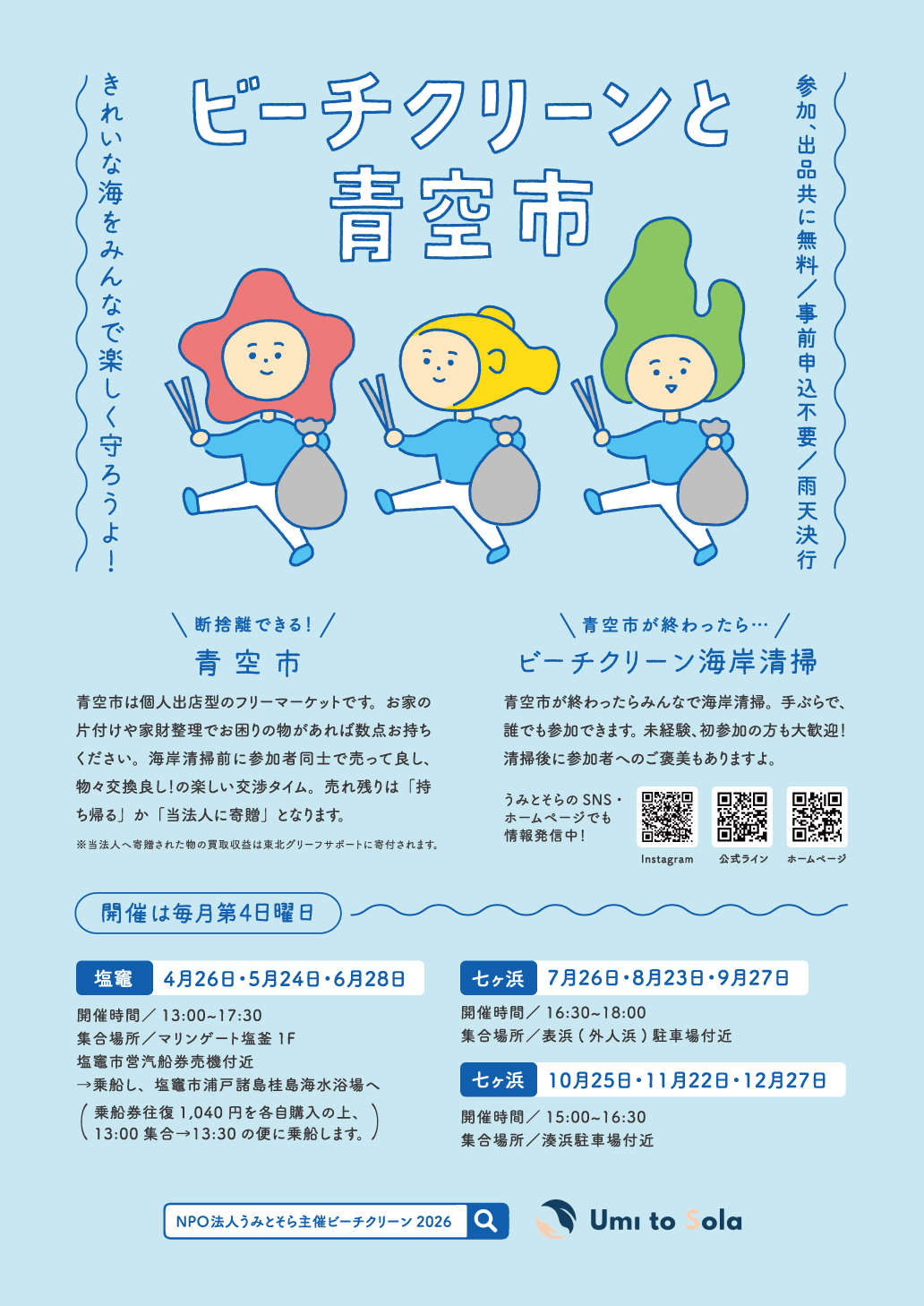 宮城県塩竈市港町1-4-1 2026/04/26~2026/04/26 Umi to Solaは 「宮城の海を美しく保つため」 「みんなの集まる居場所をつくるため」 町内会と子供会をミックスさせたような、たのしげな会を毎月行っております。 私たちと一緒に楽しみながら海をきれいにしませんか?