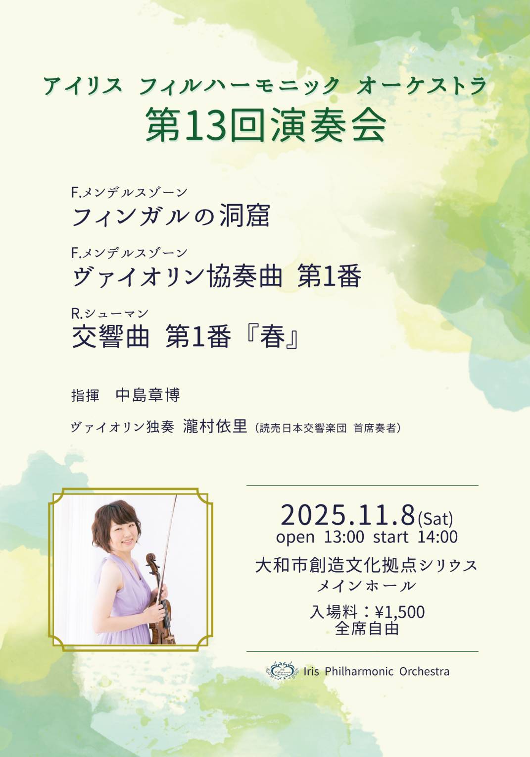 神奈川県大和市大和南一丁目8番1号 2025/11/08~2025/11/08 読響首席ヴァイオリン奏者・瀧村依里さんとアイリスフィル、6年ぶりの再共演をお見逃しなく!