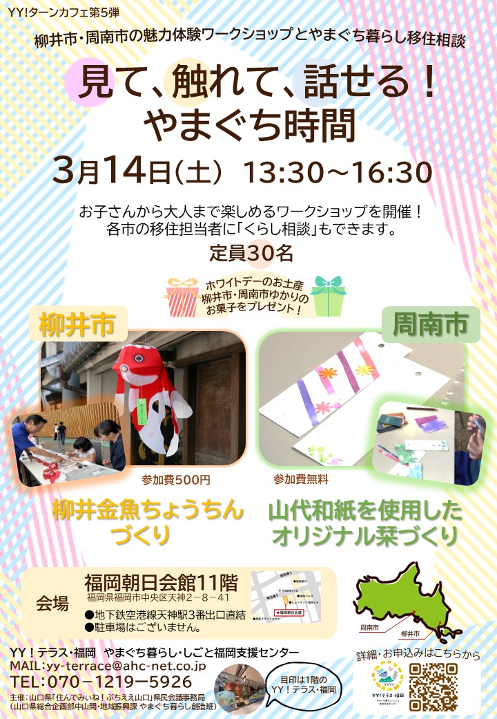 福岡県福岡市中央区天神2-8-41 2026/03/14~2026/03/14 ~柳井市・周南市の魅力体験ワークショップとやまぐち暮らし移住相談~ 山口県を身近に感じる体験型イベント 「YY!ターンカフェ第5弾」を開催します!