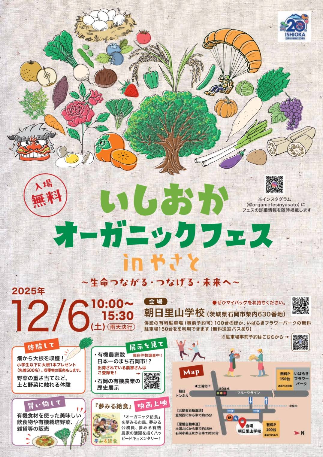 茨城県石岡市柴内630番地 2025/12/06~2025/12/06 地元の有機野菜や食材を味わい、自然と人、人と人を結ぶ。石岡・やさとから未来へつなぐオーガニックフェス