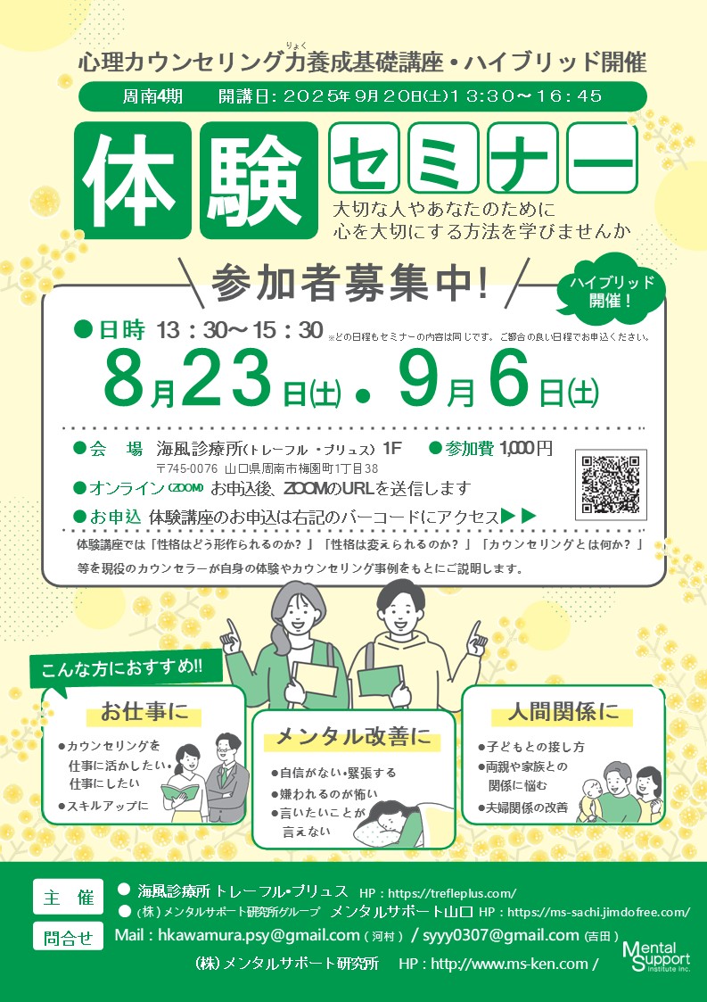 周南市梅園町1-38 2025/08/23~2025/09/06 大切な人やあなたのために、心を大切にする方法を学びませんか。