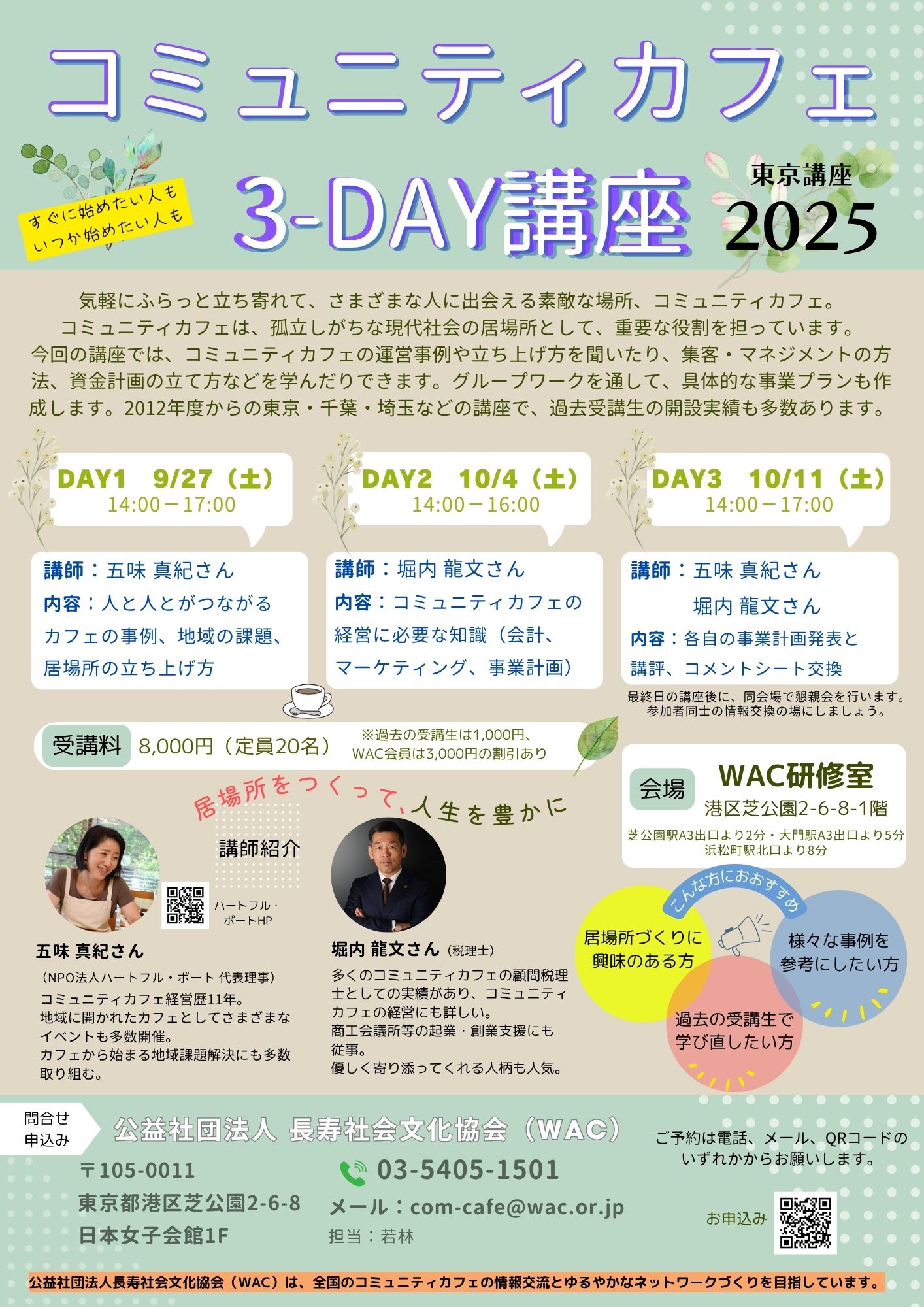 東京都港区芝公園2-6-8 日本女子会館1階 2025/09/27~2025/10/11 誰でもが立ち寄れる気軽な居場所『コミュニティカフェ』 ゆるく、人との付き合いをはじめたい方、何かやってみたい方、少人数で集まる場所をつくってみませんか!