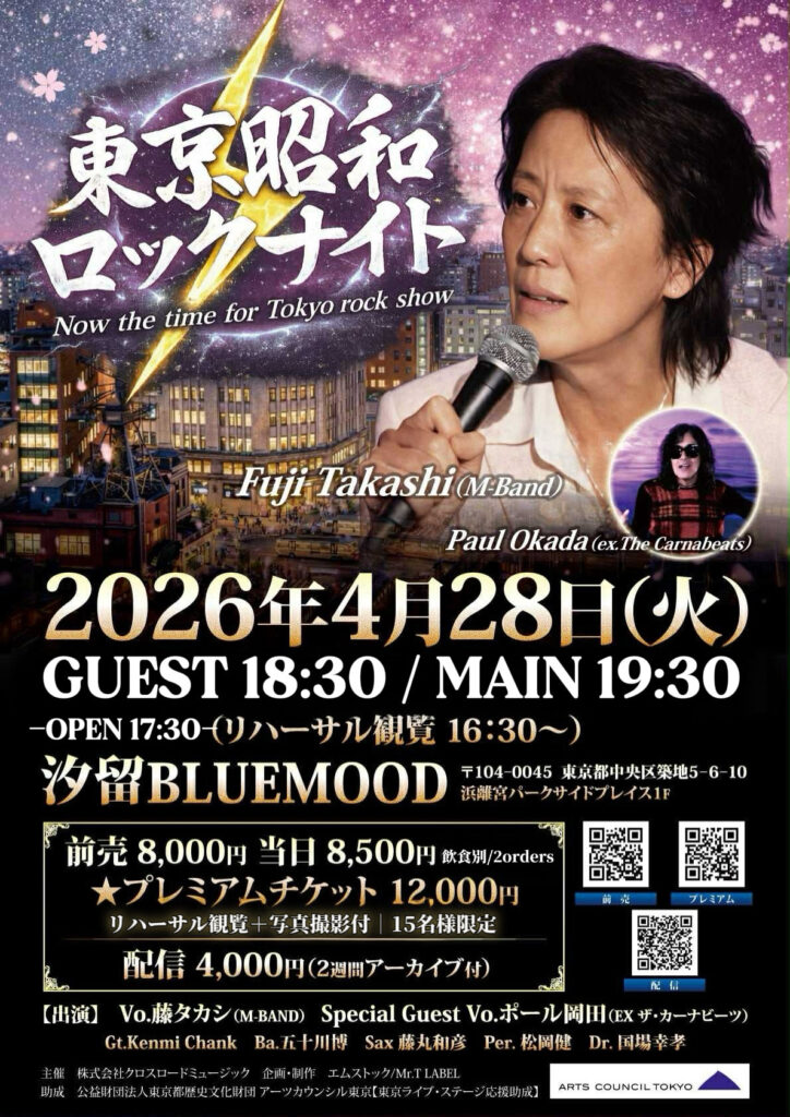 東京都中央区築地5丁目6−4 パークサイドプレイス1F 2026/04/28~2026/04/28 デビュー40周年を超えてもまだなお現在進行形で走り続ける東京生まれ東京育ちのJROCKレジェンド藤タカシの今を表現するイベントの一環で今回は昭和ロック&洋楽カバーを中心に構成されています。