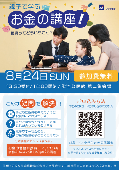大阪府豊中市蛍池中町3丁目2−1 ルシオーレ5F 2025/08/24~2025/08/24 お金ってどうやって使うの? 投資ってこわくないの? そんな疑問を、親子で一緒に楽しく学べるチャンス!