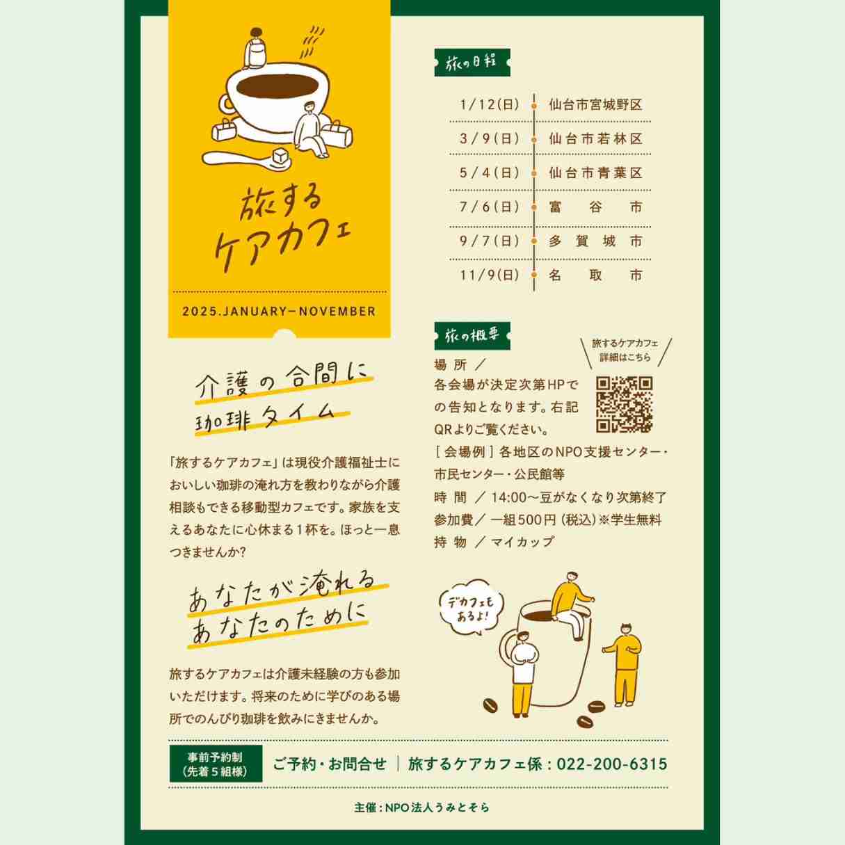 宮城県仙台市宮城野区榴ケ岡5番地 2025/01/12~2025/01/12 「ケアする人をケアする」 本人や家族、地域住民や福祉専門職など誰もが気軽に立ち寄れるカフェ。 (仲間同士、お子様連れでも気軽に入れます。)