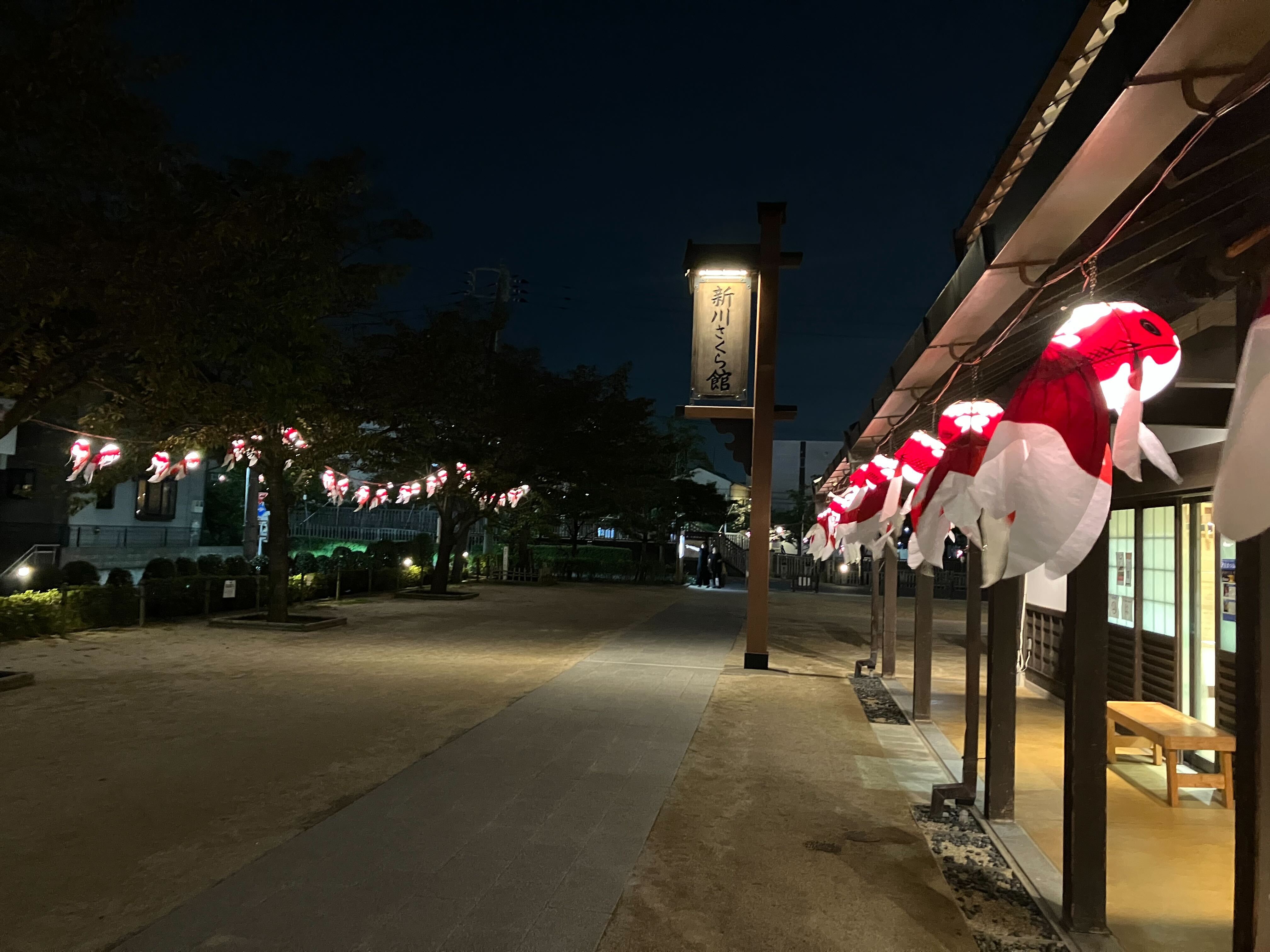 【金魚ちょうちん飾り・金魚イルミネーション】新川さくら館 夏の風物詩!新川沿いとさくら館広場が、可愛らしい金魚ちょうちんと幻想的なイルミネーションで彩られます。今年はさくら館の建物自体がイルミネーションで華やかに!夕涼みにぴったりのスポットです。