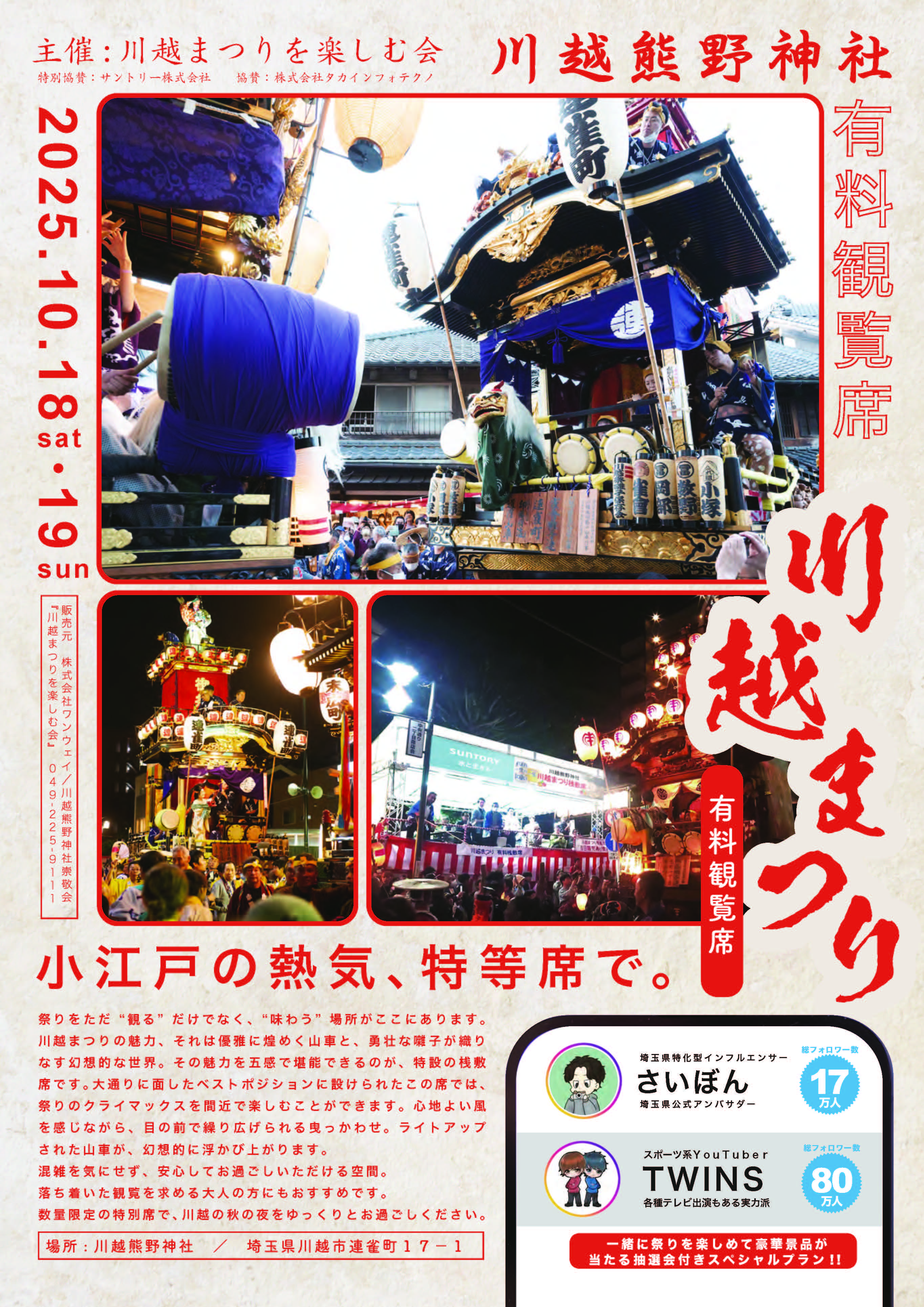 川越まつりの豪華絢爛の山車(世界遺産登録)の競演を目の前の特別桟敷席で観覧できます。昼の部は、インフルエンサー「さいぼん」とYouTuber 「TWINS]と「川越まつりを楽しむコース」です。豪華賞品が多数当たるイベントも開催中
