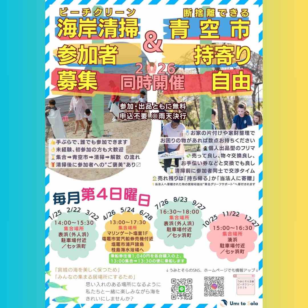 主催:NPO法人うみとそら(みやぎスマイルビーチ・プログラム スマイルサポーター 第5033号) 協力(敬称略):七ヶ浜町、仙台市、塩竈市、日本財団 ***************** 地域の場づくり -Umi to Sola- でんわ 022-200-6315 ライン https://lin.ee/UE027Z9 *****************