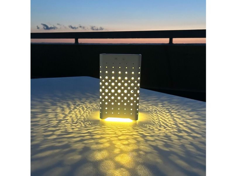 太陽光で充電して暗くなると自動で点灯する、便利なテーブル型ソーラーライトです。アルミ製の本体に施されたドット状の穴から漏れる光が美しい陰影を描き、ナイトイベントの雰囲気づくりにぴったり。コンセント不要で置くだけ簡単、屋外でも安心してご使用いただけます。