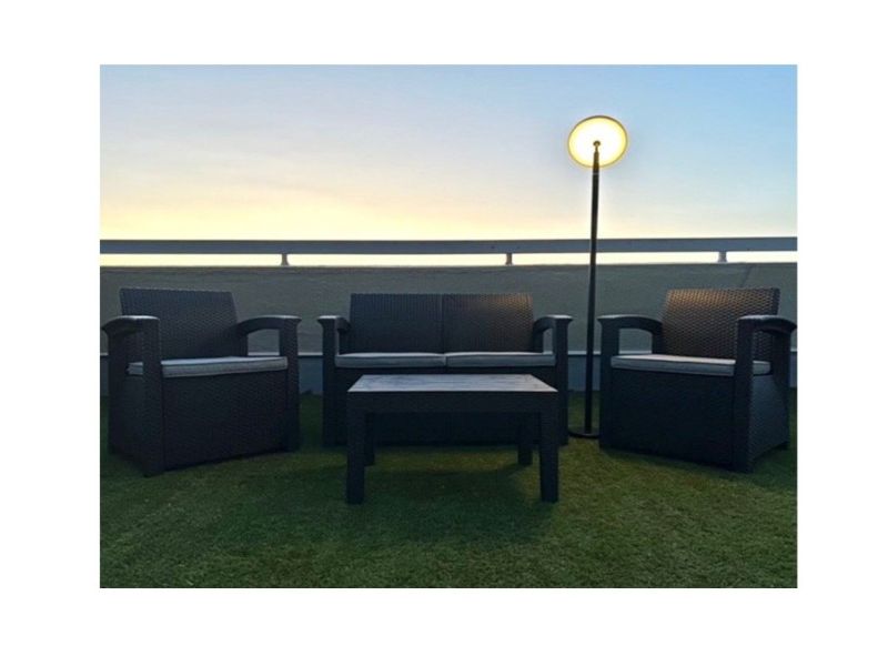 太陽光で充電するスタンド型のLEDソーラーライトです。完全充電時は連続で約10〜12時間使用でき、コード充電にも対応しています。明るさはボタン操作で5段階(100/300/500/700/1000ルーメン)に調整可能。付属の固定用ペグで地面にしっかり固定できるため、屋外イベントのアプローチ照明やライン照明として設置しやすく設計されています。