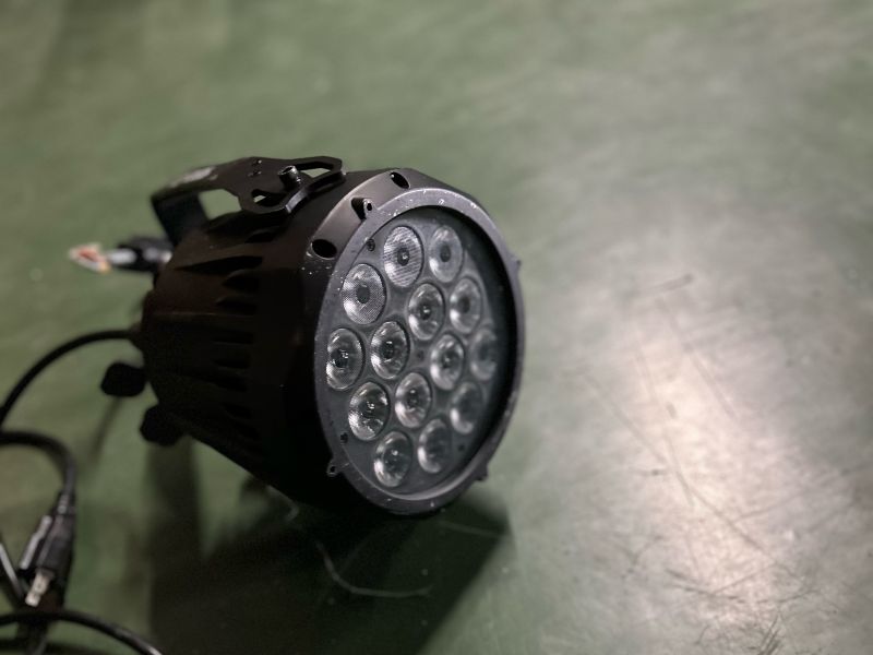 LEDパーライト(14灯/RGBW 4in1)。低消費電力でもしっかり明るく、壁面ウォッシュやフォトブースのベースライトなど幅広く対応。IP65の堅牢設計と防滴コネクタで、仮設・屋外イベントでも取り回しがしやすい1台です。複数台を同色で揃えるだけでも空間の統一感が出せ、フェード演出を加えると入退場の“メリハリ”づくりにも役立ちます。