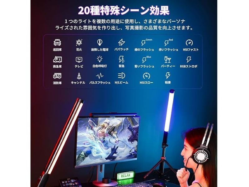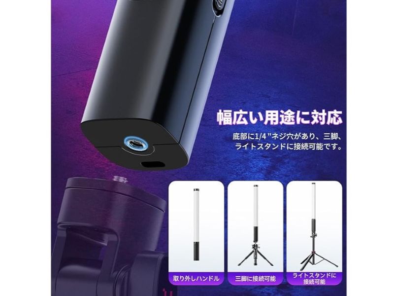 このLEDチューブライトは、色温度2500~9000KとRGBフルカラーに対応し、20種類のFX効果まで搭載。被写体の質感を損なわないCRI95の自然な発色で、物撮り・人物・装飾まで幅広く使えます。軽量・細身のスティック形状はレイアウト自由度が高く、1/4インチねじ穴でクランプやスタンド固定も簡単。USB Type-C充電の内蔵バッテリー駆動なので、電源取り回しが難しい現場でも扱いやすいのが魅力です。