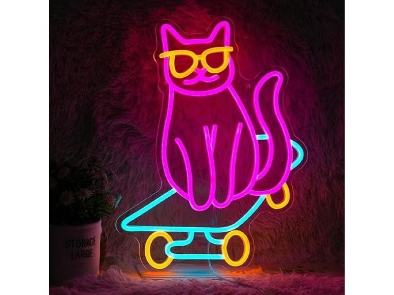 メガネ×スケボーの猫モチーフが、通行視線を軽やかにさらうネオンサイン。およそ43×33cmでフォトに収めやすく、USB給電・調光対応で運用もしやすい設計。壁掛け用のウォールマウントとフックが付属しており、催事のバックボードやシステムパネルにも合わせやすい1枚です。サイズに余裕があるため、離れても認識されやすいのが強みです。