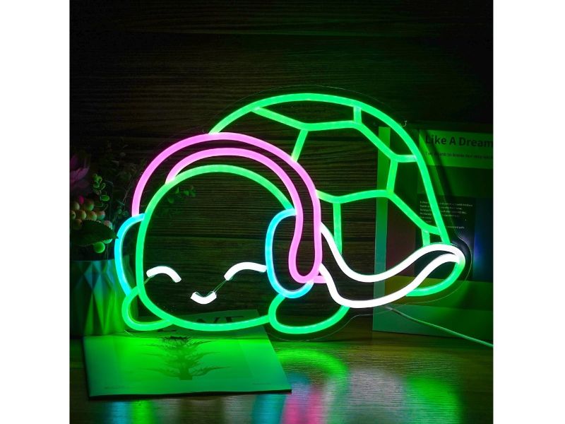 かわいいカメのシルエットが特徴のLEDネオンサイン。アクリル製の光るラインが柔らかい雰囲気を演出しつつ、存在感も十分。USB給電で設置の自由度が高く、調光対応なのでイベントや店舗の照明環境に合わせたムード作りが簡単です。大きすぎず小さすぎず、フォトスポットや物販エリアのアクセントとして使いやすい一枚です。